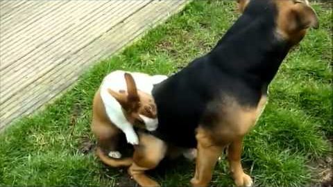 A cat caught a small rabbit and jumps onto a balcony with its prey in its mouth before letting it go..