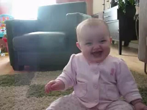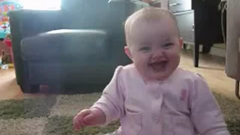 A baby gets a laugh with the dog that eats popcorn