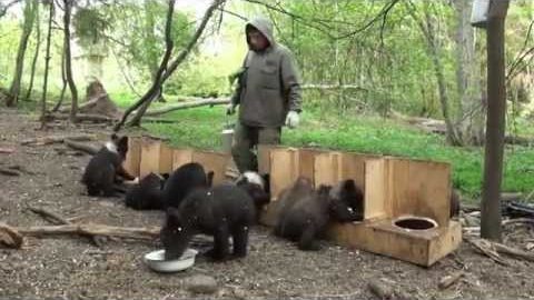 In Toropets in Russia, It is time for breakfast. These small stuffed animals have been rescued from the sewage plant workers 'Clean Forest', when their mothers were killed by poachers.