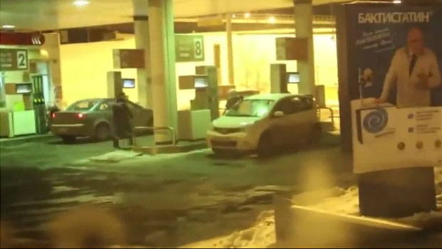 At a gas station in Russia, a woman tries to wash the windshield of her car with petrol pump. Fortunately an employee who monitors finally gives in infinite stupidity.