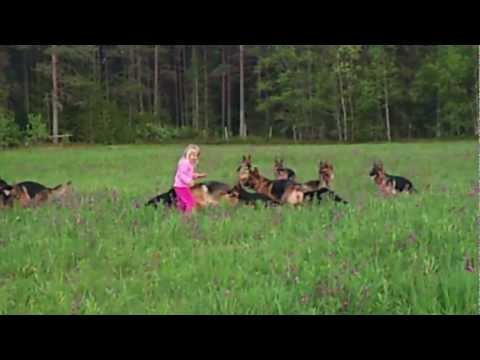14 German Shepherds from kennel Finika Norway playing with a little girl