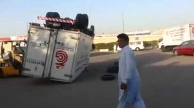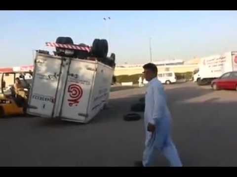 Workers in Pakistan trying to topple off a truck.
