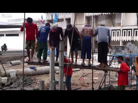A group of construction workers in Thailand using rhythmic weight to sink one picket.