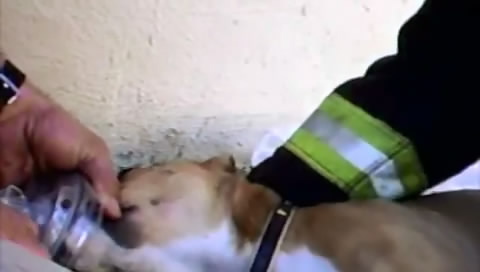 Firefighters make artificial respiration take back a dog, He was found unconscious after a fire at a house in Auckland.