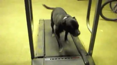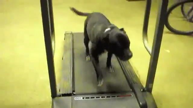 A dog is for the first time using the treadmill and lose for a moment the balance of.