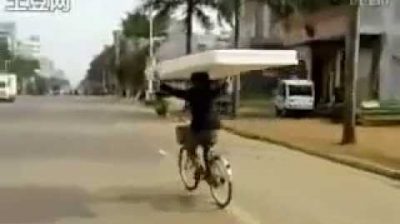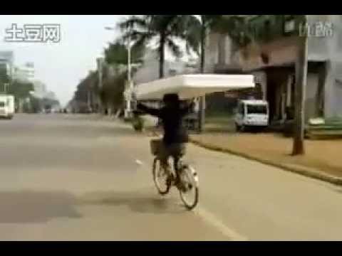 A man in China manages to ride his bike without hands, while balancing a layer onto the head of.