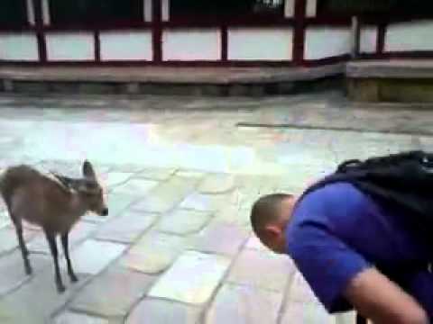 A small deer politely greets guests at Todai-ji Temple of Nara City in Japan.
