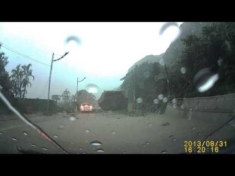 Car dashboard camera captures an incredible landslide in Taiwan's Keelung, where a huge rock lands on the road. A guide saves miracle.