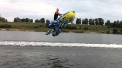 A video that comes from Russia, where we see an inflatable called 'flying skate'. It can carry one person, and with the help of a jet ski flying in the air at high speed.