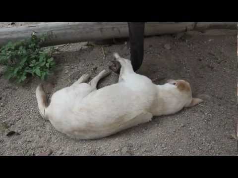 A small elephant, a cock and a man trying to wake up a dog, without great success.