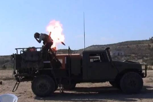 Two Spanish soldiers make shot mortar, When a missile fails to launch. Luckily the missile did not explode and the soldiers eschewed the risk.