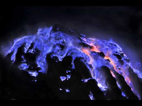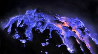 Kawah Ijen volcano in East Java, Indonesia, produces molten sulfur, that seeps out of the sides of. Burning sulfur appears red during the day, but at night the blue flames singles, creating a spectacle.