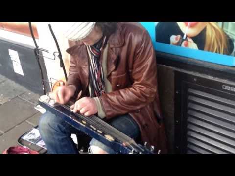 On a sidewalk of Brighton in England, a wonderful Street musician playing blues guitar in an unusual lap slide.