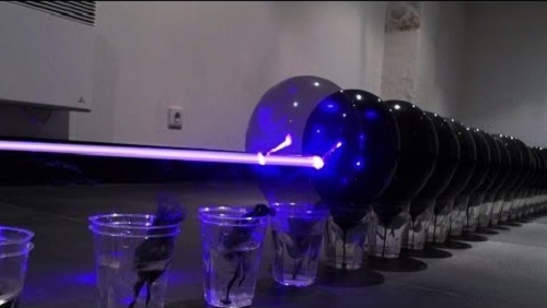 A makeshift laser pointer with passage of a Blue-Ray Recorder, 100 pierce balloons in a row, in 7 seconds.