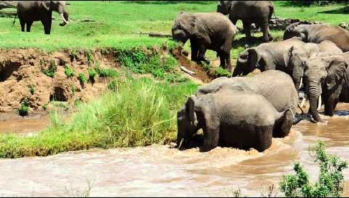 At Ol Pejeta Wildlife Park, Kenya, a herd of elephants through the Ewaso Nyiro River. A small elephant drifting from the strong currents of the river, and the mother hurries to help. And then other family members help until the small elephant pass the river safely.