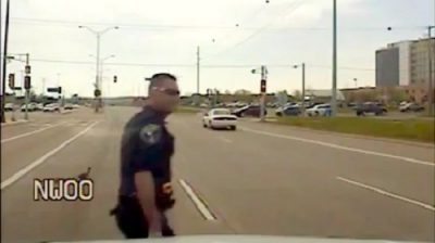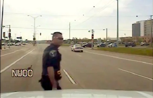 Police in Wisconsin USA stops traffic to cross the street a duck and her cubs.