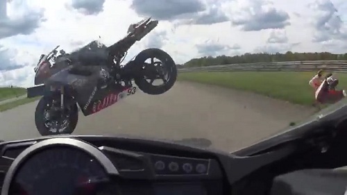 Unusual accident motorcyclist, that conflicts with a flying motorcycle in the circuit of Beaverun (Pennsylvania – USA). Both riders are well in their health.