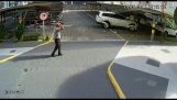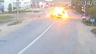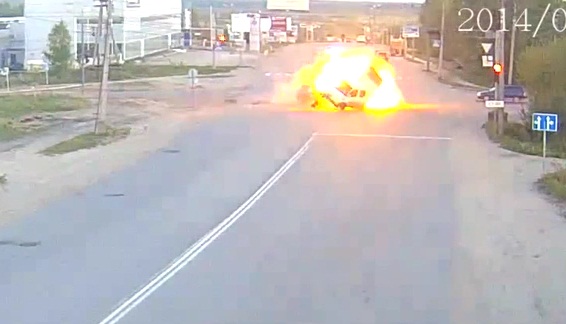 On May 28 at Syktyvkar Russia, 6 people were injured after an unusual car accident. Drive (Mitsubishi Outlander) hit a van which exploded during the conflict and caught fire
