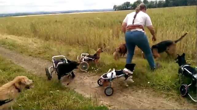 The Gotz Gritta, working at animal asylum in Germany Lanzenhainer, playing with handicapped dogs that use stroller. Dogs play with joy and can't seem to find it very difficult to run.