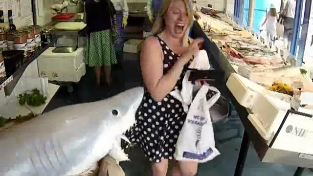 In furtherance of the film 'Sharknado 2', members of a group of film effects installed a animatroniko shark in a fish shop in London. When customers pass by in front of, he suddenly comes alive and scares them.