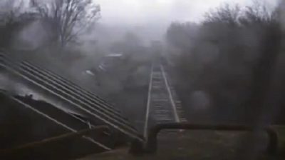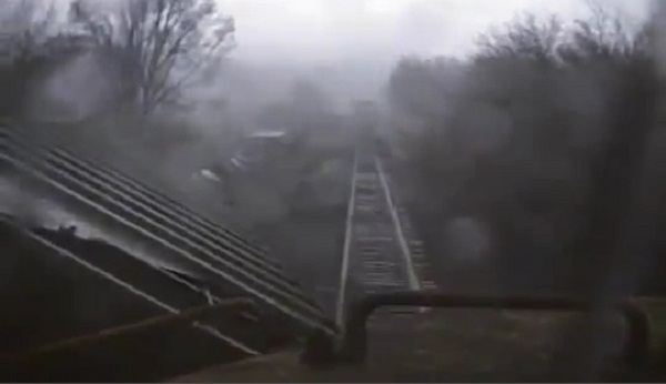 A video from January 2008 in Illinois US, where a train passes through a tornado. One of the carriages off the rails and drifted along the whole train.