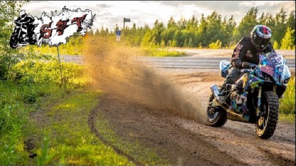 The Juha Ruokolainen from stunt team StuntFreaksTeam, changing tires on a Suzuki GSX-R (1000cc / 175 hp) and do a quick race in dirt track.