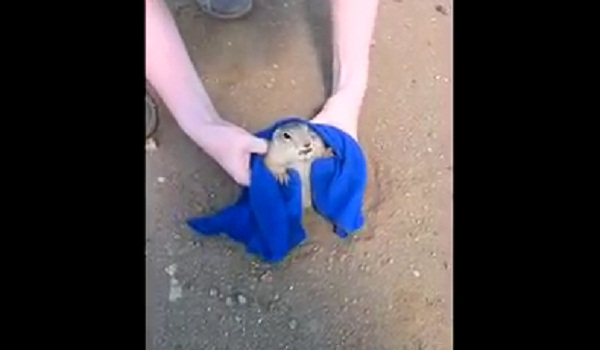 A gewmys that sfinwse in the hole, accepts help from a couple in Olkhon Island, Russia. The little rodent probably ate more than it should have.