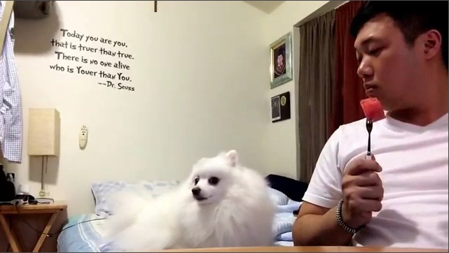 While he wants to eat a piece of watermelon, a man has a feeling that he is monitored by his dog Kooroo. The Kooroo loves fruits, and beg when owners continuously sees them to eat. But when told not, avoids the look in the eyes.