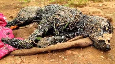 In India, a dog was found trapped in a pool of hot tar. A passerby who saw him, requested fast help, and many people came to save the unlucky animal. The dog nearly died from asphyxia, After the pitch began to stiffen up in the body of. After many hours of massage with herbal oil, four people managed to make the tar out of the coat.