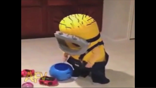 A small fry who is dressed minion, He loses his balance and falls. Quickly notify parents that hasn't hit.