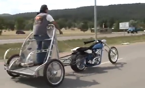 In the way of South Dakota (USA), a man drives his motorcycle onto the trailer to form ancient Roman trolley. With an ingenious patent, connected the steering wheel, throttle and brake with twine so it can lead.