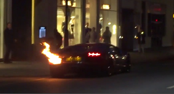 A Lamborghini Aventador from the 'Gumball 3000' race puts on a little show for the world in central London, When exhaust flames causing a small fire in the rear of the car.