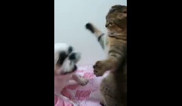 A cat tries to defend himself by using boxing techniques against a very dangerous dog Sikhs-Tzu.