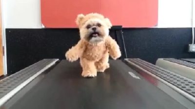 A new funny dog videos dressed Teddy bear, who now does some exercises on the treadmill. The idioktitria of the teddy bear dressed for Halloween and recorded this funny scene.