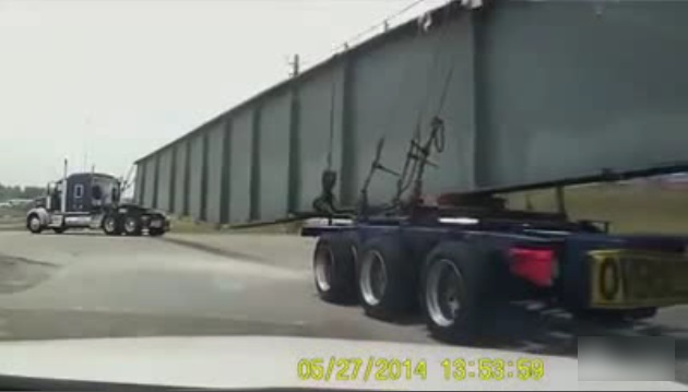 Truck carrying a huge metal girder without the proper equipment or security measures. Evil will not take long to happen.