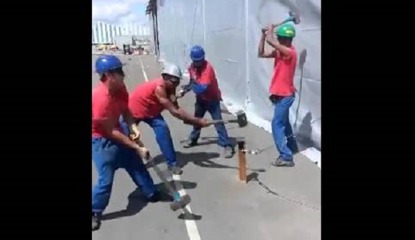 Four laborers in Brazil they pin a metal stake in asphalt, beating with the series and with absolute synchronization.