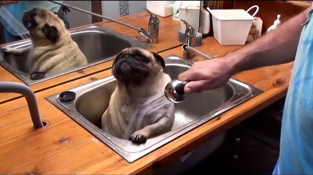 A man captures the reactions of his dog Barry, the moment that makes his favorite bathroom sink. The Barry is very cooperative in bathroom, waiting anxiously for the shower with hot water and beats his feet with pleasure when the rub.