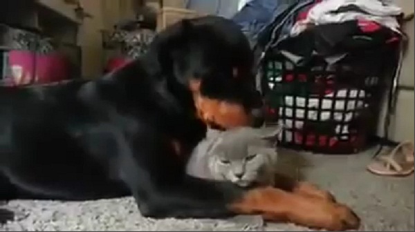 Sam, a young Rottweiler, makes a good bathroom in his beloved friend Aron, They seem to enjoy.