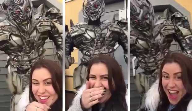 The theme park of Universal Studios in Hollywood, a girl wants to pull a selfie with the Megkatron. But he will 'hear' them from the famous Transformers robot, that starts a funny monologue for selfies and the generation of social networks.