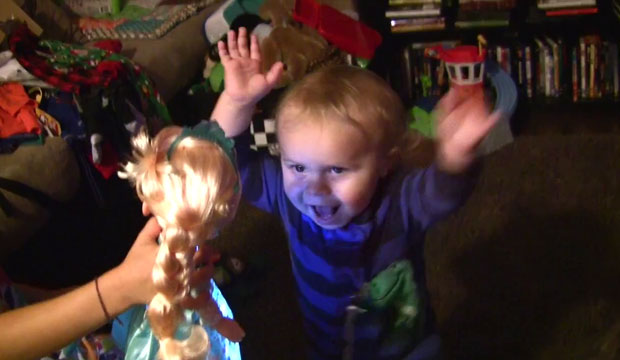 A little boy and his sister play with the 'Snow Queen', a doll from the famous children's movie 'Frozen'. The doll has a button, which when pressed plays the song “Let It Go” from the movie. Each time the doll sings, the Nipper holds up his hands and begins his own very funny choreography.