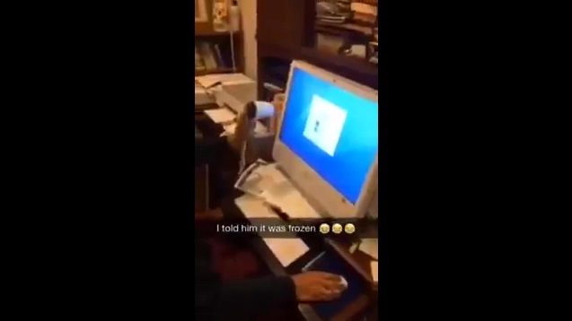 A man comes out of his office and forget that the headset is still connected to the computer. A joke...