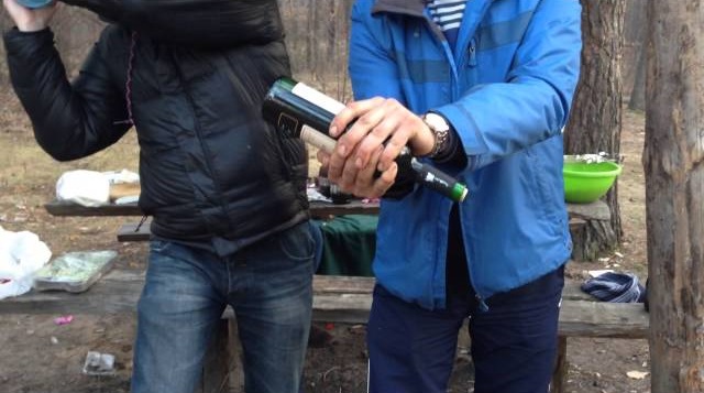 Alternative way to open a bottle of wine if you don't have a can opener.