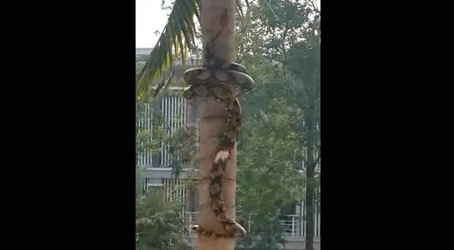 A Phitsanulok, a town in northern Thailand, a man recording with his cell phone a python 20 kg to make climbing a tree. The technique involves wrapping his body around the trunk, in order to be able to get push during the ascent. Repeating this movement until it reaches the target of.