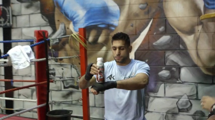 During a break from coaching, the British Boxer Amir Khan makes a small Bay with a plastic bottle. I use a small plastic bottle as a boxing bag twisting it several times in the air with his fists.