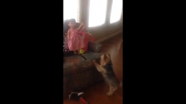 A small Yorkshire Terrier trying to convince a doll that sits in an armchair, to play with him. The dog carries a tennis ball and wait patiently for the doll to the fly.