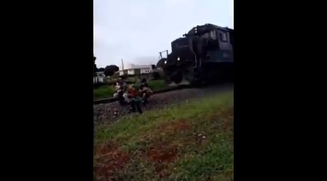 A family in Brazil stands on train lines posing for a photo, without giving importance to the approaching train. Eventually he was very lucky, as the passing train struck a father holding his small son, but without injuring them seriously.