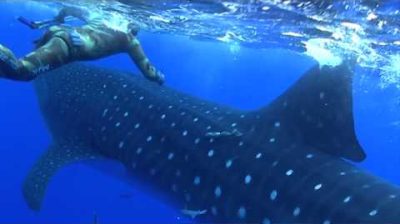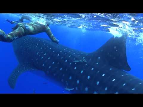 Watch closely as this spearfisher has a close call with a whale shark in the Atlantic Ocean.