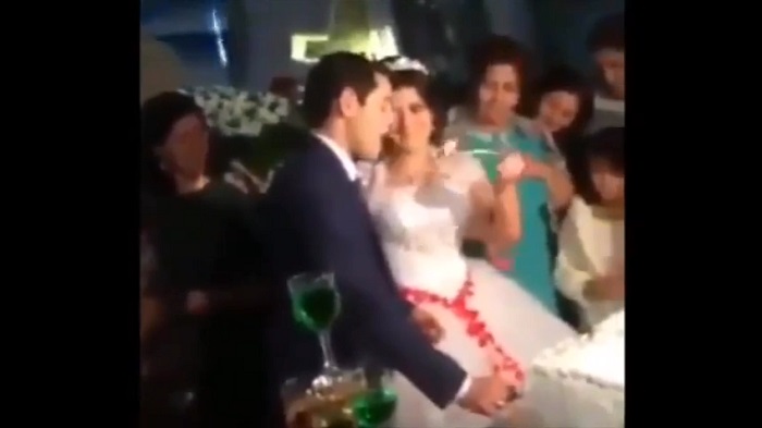 During a wedding dinner in Turkey, the groom with the bride upset trying to play with a romantic game.