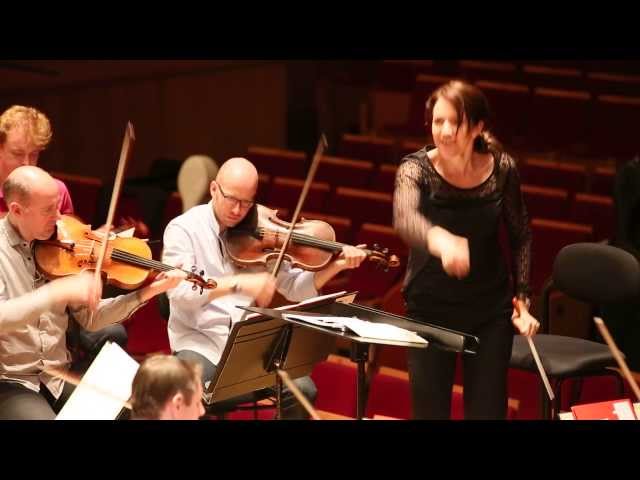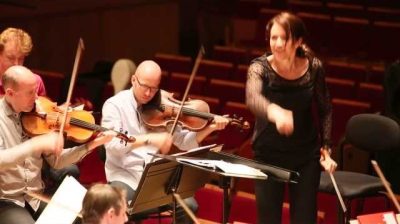 The conductor Alondra de la Parra from Mexico, seems to be amused enough by doing rehearsals with the Orchestra before a concert in Paris.
