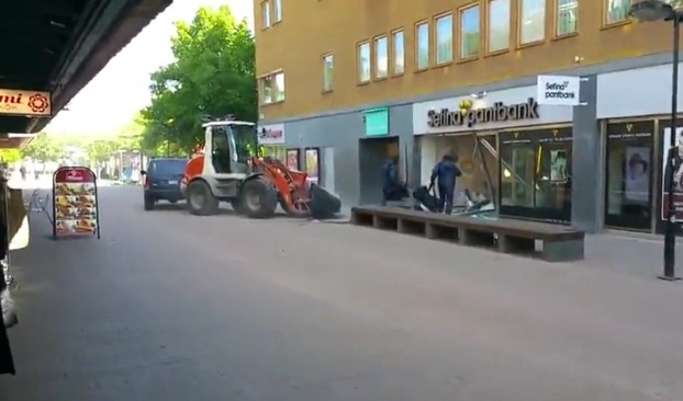 On Monday, June 15, 2015 in the region Skärholmen, Stockholm, Sweden, a pawnshop became the target of thieves. The three men were enlisted a digger to break the thick glass of the shop. A passerby shortly down the road was able to record the scene with his mobile phone, and called help. The three armed masked men entered the shop and stole a large sum of money, While then fled in an SUV.